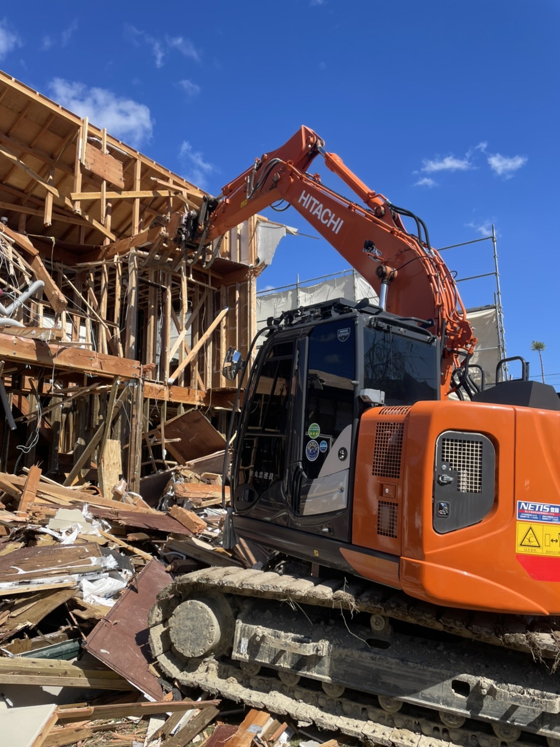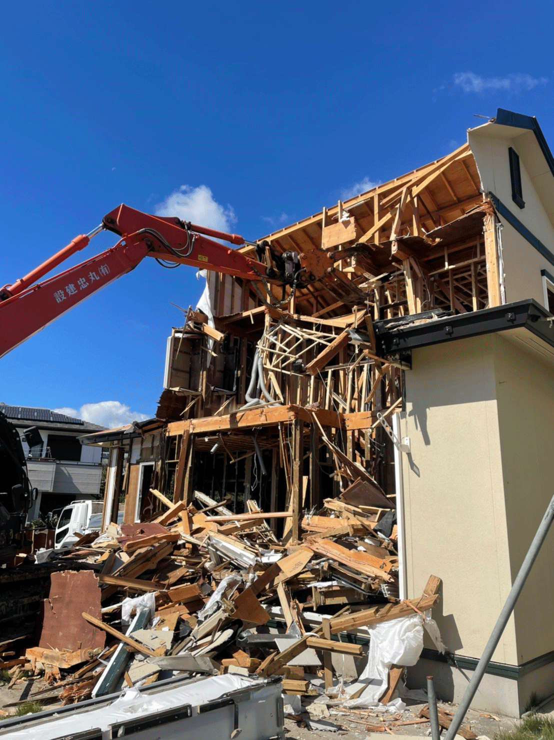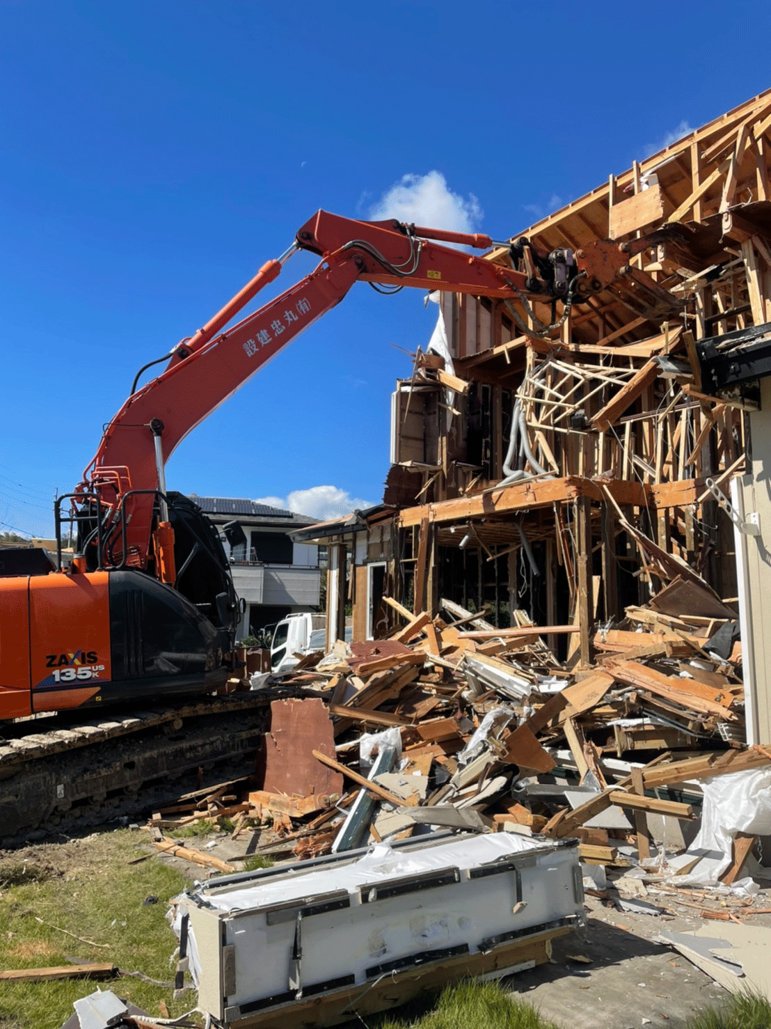 こちらは木造戸建住宅の解体工事の様子です。パワーショベルを使用し、安全第一で丁寧に作業を進行していきます。もちろん瓦礫の撤去も一貫してお任せいただけます。