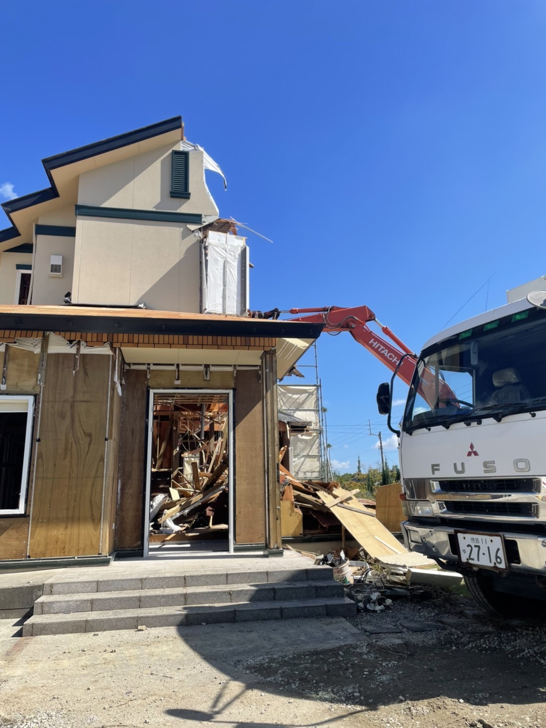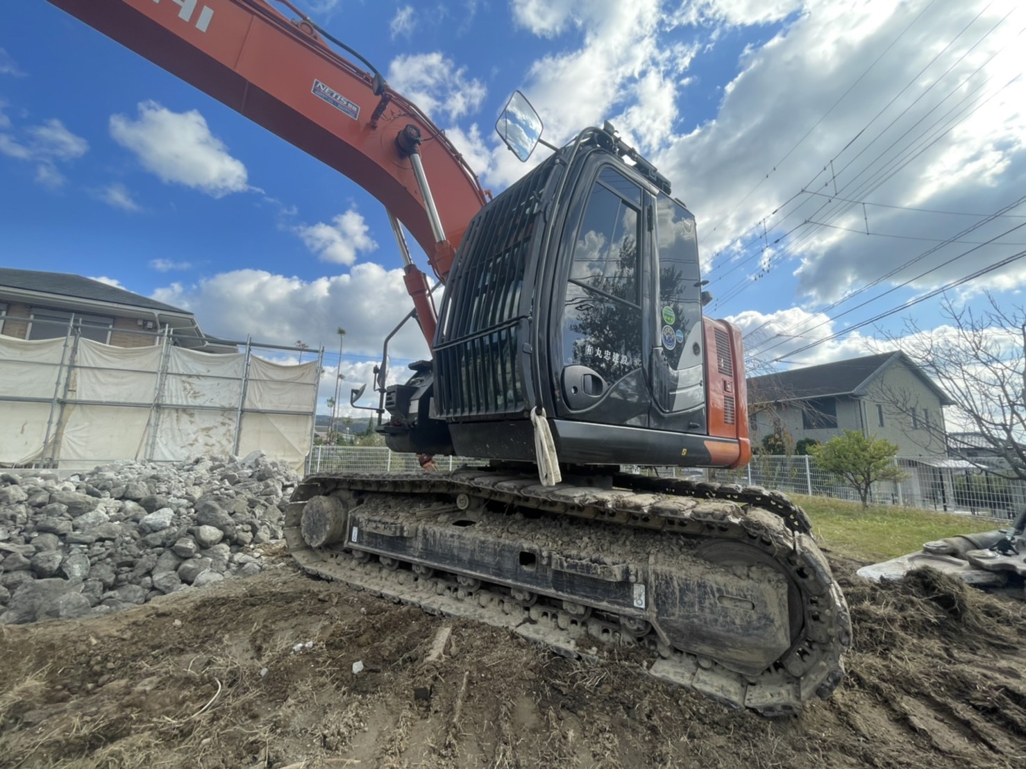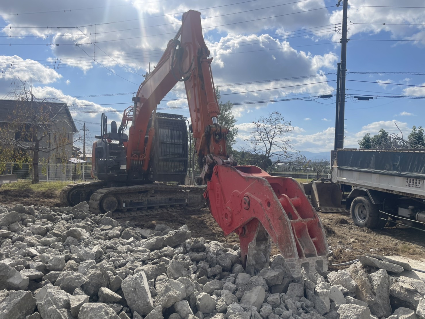 こちらは木造戸建住宅の解体工事の様子です。パワーショベルを使用し、安全第一で丁寧に作業を進行していきます。もちろん瓦礫の撤去も一貫してお任せいただけます。